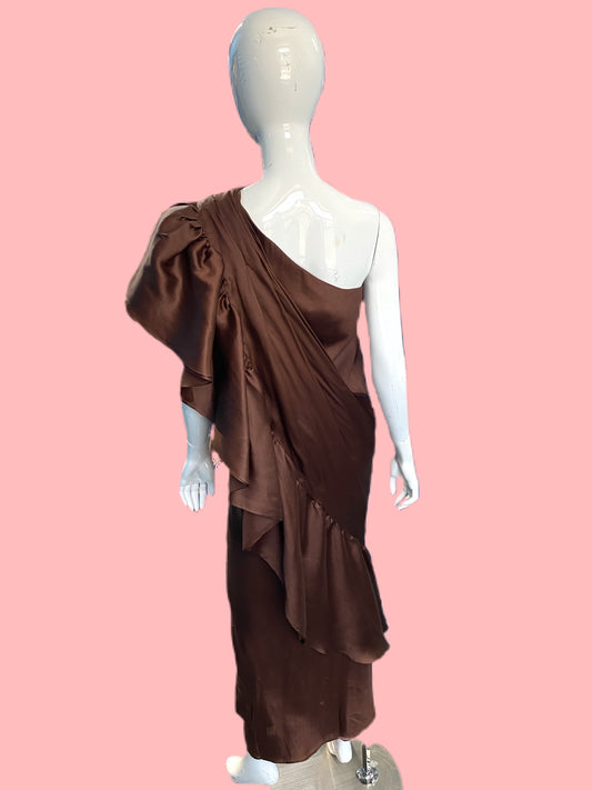 1970’s Halston Chocolate Silk Chiffon One Shoulder Ruffle Gown